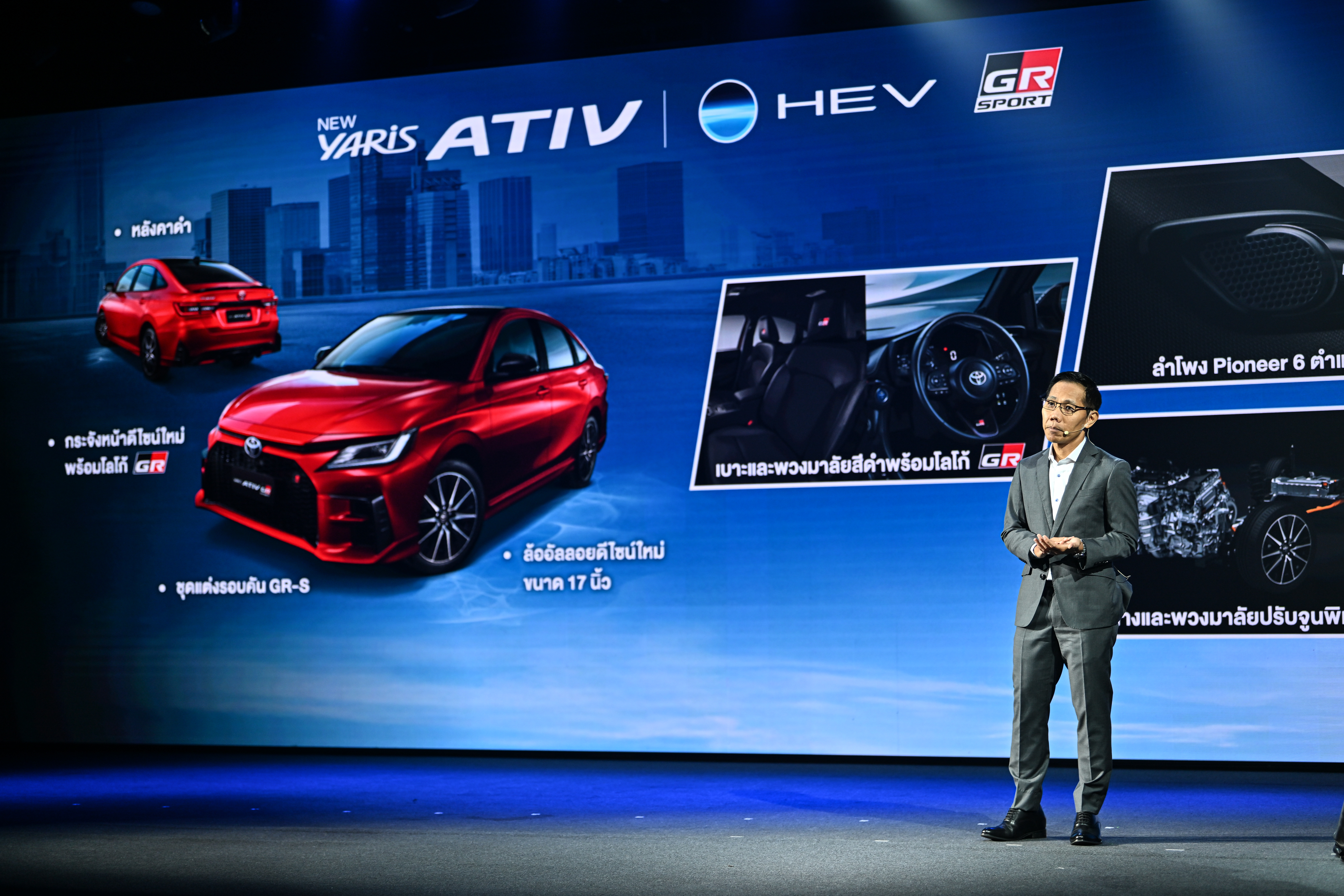 และสำหรับ รุ่น HEV GR Sport ยังโดดเด่นด้วยดีไซน์สปอร์ตและระบบช่วงล่างที่เป็นเอกลักษณ์ มอบประสบการณ์การขับขี่ที่สนุกสนานยิ่งขึ้น โดยมร. คาซุฮิโกะ โยชิโอกะ ผู้จัดการโครงการพัฒนาผลิตภัณฑ์ YARIS ATIV จะะแจ้งรายละเอียดเพิ่มเติมในภายหลัง