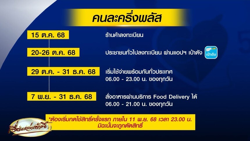 ครม.อนุมัติ คนละครึ่งพลัส ประชาชนลงทะเบียนผ่านแอปฯเป๋าตัง 20-26 ต.ค.68 ใช้สิทธิ 29 ต.ค.-31 ธ.ค.68 เผยต้องใช้สิทธิครั้งแรกภายใน 11 พ.ย.68 เพื่อไม่ให้โดนตัดสิทธิ รอบนี้ใช้จ่าย Food Delivery ได้ตั้งแต่ 7 พ.ย.68 สั่งอาหารได้ตั้งแต่ 06.00-21.00 น. ลั่นกระตุ้นเศรษฐกิจได้ 0.3-0.4 ของ GDP ฟื้นเศรษฐกิจไทยพ้นติดหล่มช่วงไตรมาส 4 เอกนิติ บอกร้านค้าอย่ากังวลภาษีย้อนหลัง ชี้ไม่เอารายได้นี้เข้าระบบภาษีแน่นอน