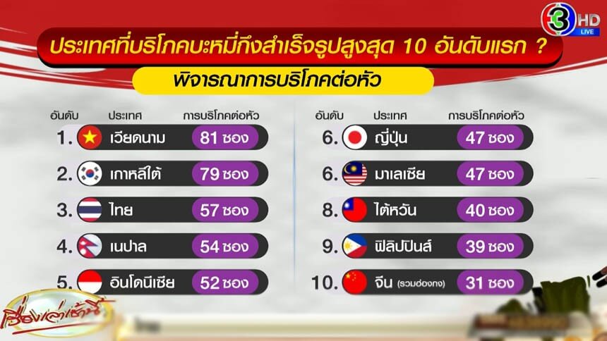 สมาคมบะหมี่กึ่งสำเร็จรูปโลก เผยผลการสำรวจประเทศที่บริโภคบะหมี่กึ่งสำเร็จรูปมากที่สุดในปีที่ผ่านมา พบว่า คนไทยบริโภคบะหมี่กึ่งฯ รวมกว่า 4.08 พันล้านซอง คิดเป็นจำนวนเฉลี่ย 57 ซองต่อคน มากสุดเป็นอันดับ 3 ของโลก เป็นรองเพียงเวียดนามและเกาหลีใต้