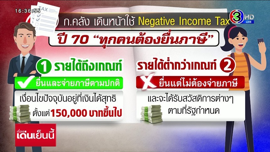 Negative Income Tax หรือ แนวคิดภาษีเชิงลบ คือ ระบบที่ให้ประชาชนทุกคนต้องยื่นแบบภาษี แม้มีรายได้น้อยกว่าค่าลดหย่อน (150,000) เพื่อให้รัฐใช้ข้อมูลรายได้คัดกรองสิทธิ์สวัสดิการอย่างแม่นยำ ถ้ารายได้สูงกว่าเกณฑ์ หรือ สูงกว่า 150,000 บาทต่อปี เท่ากับ จ่ายภาษีตามปกติ ถ้ารายได้ต่ำกว่าเกณฑ์ เท่ากับ ไม่ต้องเสียภาษี เพราะไม่ต่างจากภาษีติดลบ และจะได้รับเงินช่วยเหลือจากรัฐแทน