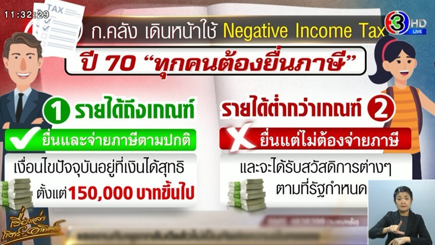 คลังเดินหน้าใช้ Negative Income Tax ปี 70 “ทุกคนต้องยื่นภาษี” เริ่มปี 70 เพื่อจัดสรรสวัสดิการให้ประชาชนที่รายได้ต่ำกว่าเกณฑ์ ได้เหมาะสม เป็นธรรม และตรงจุด