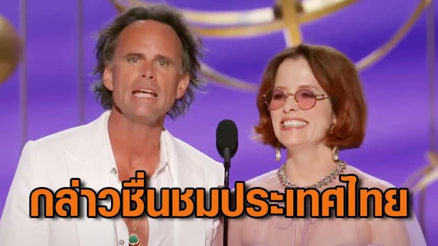 วอลตัน กอกกินส์ และ ปาร์กเกอร์ โพซีย์ 2 นักแสดงนำจากซีรีส์เรื่อง The White Lotus กล่าวชื่นชมประเทศไทย บนเวทีประกาศรางวัล Emmy Awards ครั้งที่ 77