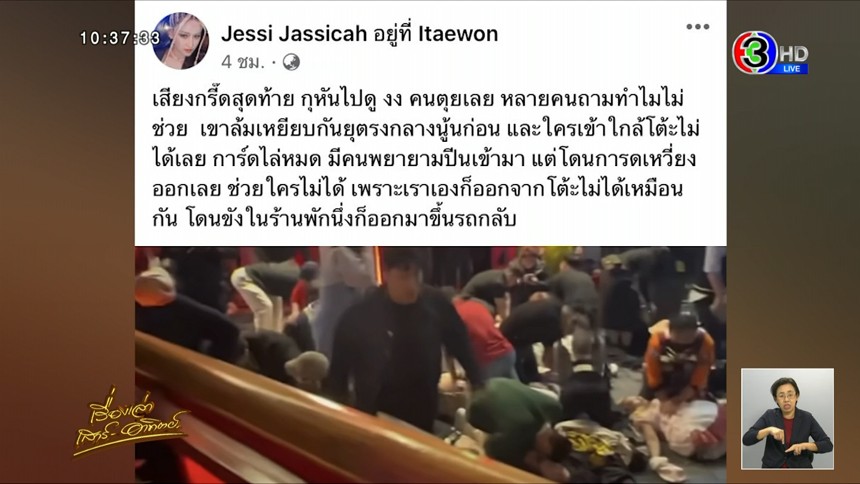 ผู้ใช้เฟซบุ๊ก jessi jassicah ได้โพสต์คลิปนาทีความโกลาหล ที่ย่านอิแทวอน โดยเป็นภาพนาทีเจ้าหน้าที่ปั๊มหัวใจช่วยชีวิตผู้บาดเจ็บ นาทีผู้คนพยายามเอาชีวิตรอด พาตัวเองออกจากจุดเกิดเหตุ โดยมีข้อความระบุว่า "โศกนาฎกรรม ต่อหน้าเลย เหยียบกัน ร้อง อิแทวอน ถ้าไม่ได้จองโต๊ะไว้ คงไปกองอยู่กับเขาแล้วอะ และจองได้ทางสามแพร่งเลย จุดเกิดเหตุนั่งเปิดแชมเปญ สักพักกลายเป็นดูคนตาย ทนอยู่ไม่ได้ ร้องไห้ กลับบ้าน"
