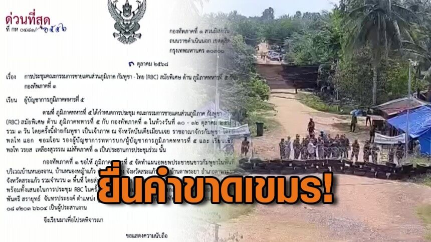 เนื้อหาในหนังสือ ระบุว่า ตามที่ ภูมิภาคทหารที่ 5 ได้กำหนดการประชุม คณะกรรมการชายแดนส่วนภูมิภาคกัมพูชา-ไทย (RBC) สมัยพิเศษด้านภูมิภาคทหารที่ 5 กับกองทัพภาคที่ 1 ในห้วงวันที่ 10-12 ตุลาคม 2568 รวม 3 วัน โดยครั้งนี้ฝ่ายกัมพูชา เป็นเจ้าภาพ ณ จังหวัดบันเตียเมียนเจย ราชอาณาจักรกัมพูชา โดยมี พลโท แอก ชอมโอน รองผู้บัญชาการทหารบก / ผู้บัญชาการภูมิภาคทหารที่ 5 และ เรียนเชิญ พลโท วรยส เหลืองสุวรรณ แม่ทัพภาคที่ 1 เป็นประธานการประชุมร่วม นั้น