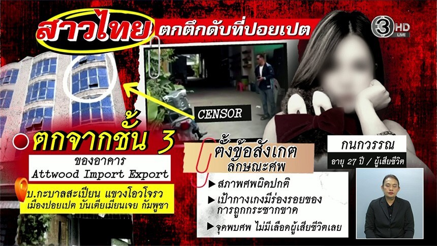 พิรุธหญิงไทยตกตึกปอยเปต คาดเอี่ยวเงินเทรดหุ้น 18 ล้าน หวั่นถูกฆาตกรรม