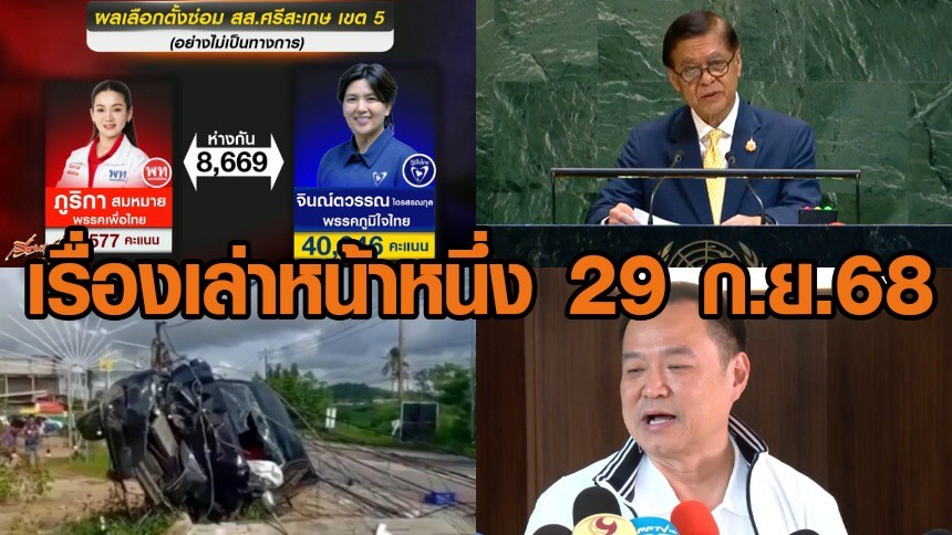 เรื่องเล่าหน้าหนึ่ง 29 ก.ย.68 ภท.ชนะเลือกตั้งซ่อมศรีสะเกษ-สีหศักดิ์แถลงเวที UN-กระบะชนเสาไฟ12ต้น