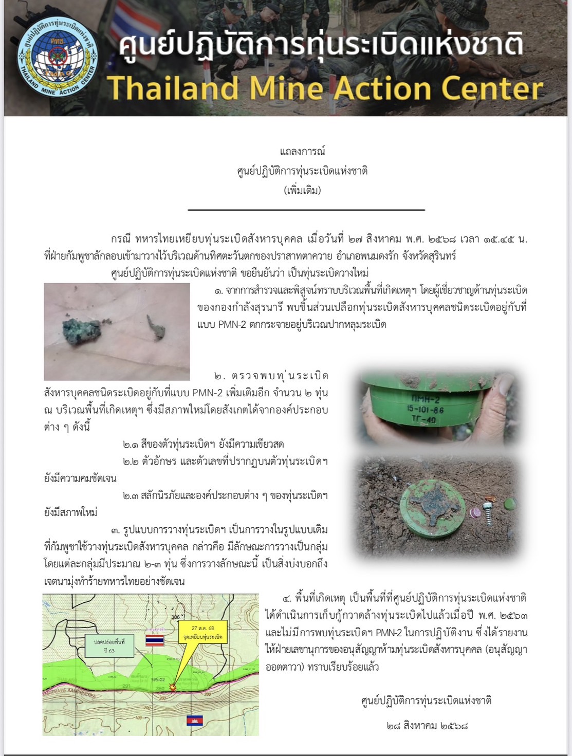 เมื่อวันที่ 28 ส.ค.68 ศูนย์ปฏิบัติการทุ่นระเบิดแห่งชาติ ออกแถลงการณ์กรณีทหารไทยเหยียบทุ่นระเบิดสังหารบุคคล เมื่อวันที่ 27 ส.ค.68 เวลา 15.45 น. ที่ฝ่ายกัมพูชาลักลอบเข้ามาวางไว้ บริเวณด้านทิศตะวันตกของปราสาทตาควาย อำเภอพนมดงรัก จังหวัดสุรินทร์ ศูนย์ปฏิบัติการทุ่นระเบิดแห่งชาติ ขอยืนยันว่า เป็นทุ่นระเบิดวางใหม่