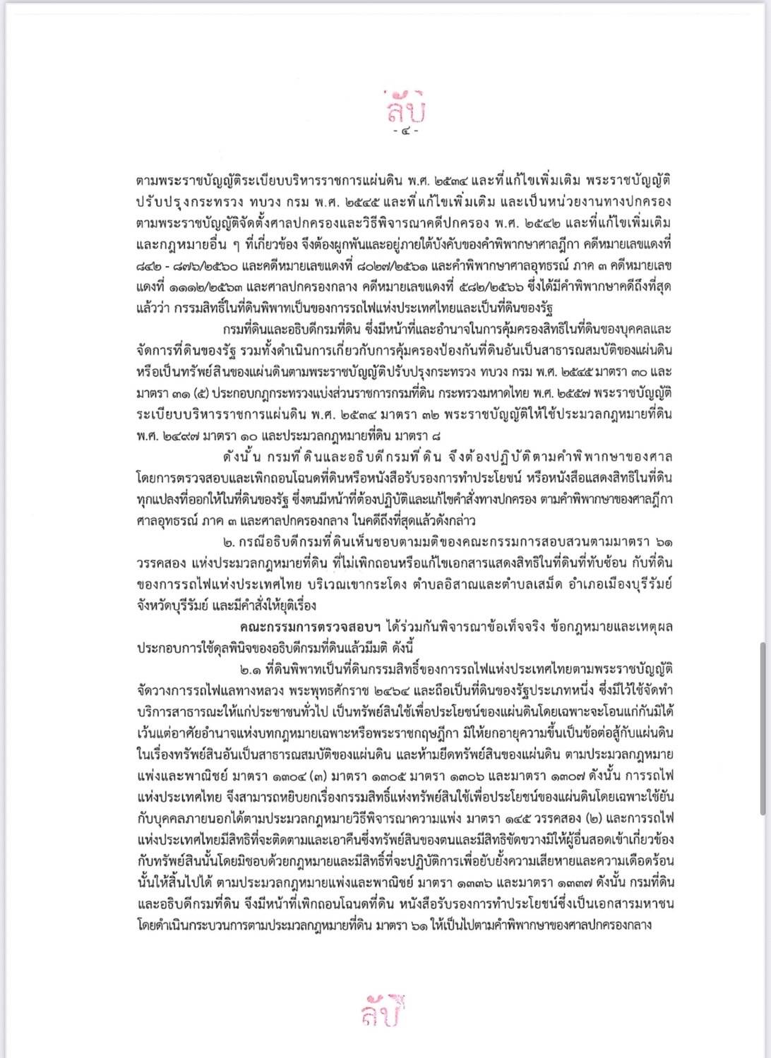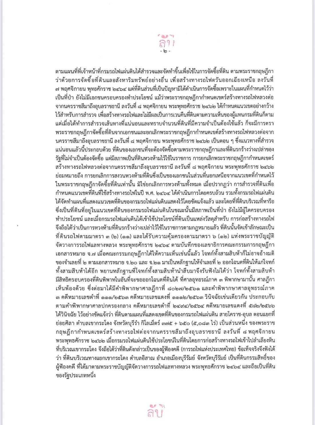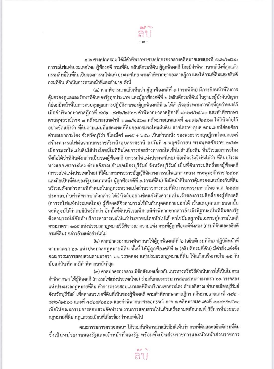 รวมทั้งดำเนินการคุ้มครองป้องกันที่ดินอันเป็นทรัพย์สินของแผ่นดินอย่างเคร่งครัด และดำเนินการตรวจสอบข้อเท็จจริงร่วมกับการรถไฟแห่งประเทศไทยเกี่ยวกับแนวเขตตามพระราชกฤษฎีกาและแผนที่แสดงเขตที่ดินเพื่อสร้างทางรถไฟและเพื่อจัดหาแหล่งวัสดุมาใช้ในการก่อสร้างทางรถไฟและลำเลียงหิน ซึ่งจัดทำขึ้นเมื่อวันที่ 18 พฤษภาคม 2465 ตามคำพิพากษาศาลฎีกาที่ 842-876/2560 คำพิพากษาศาลฎีกาที่ 8027/2561 คำพิพากษาศาลอุทธรณ์ ภาค 3 คดีหมายเลขแดงที่ 1112/2563 และคำพิพากษาศาลปกครองกลาง คดีหมายเลขแดงที่ 582/2566 เพื่อให้ได้แนวเขตที่ดินการรถไฟแห่งประเทศไทยตามพระราชกฤษฎีกาดังกล่าวให้ชัดเจน