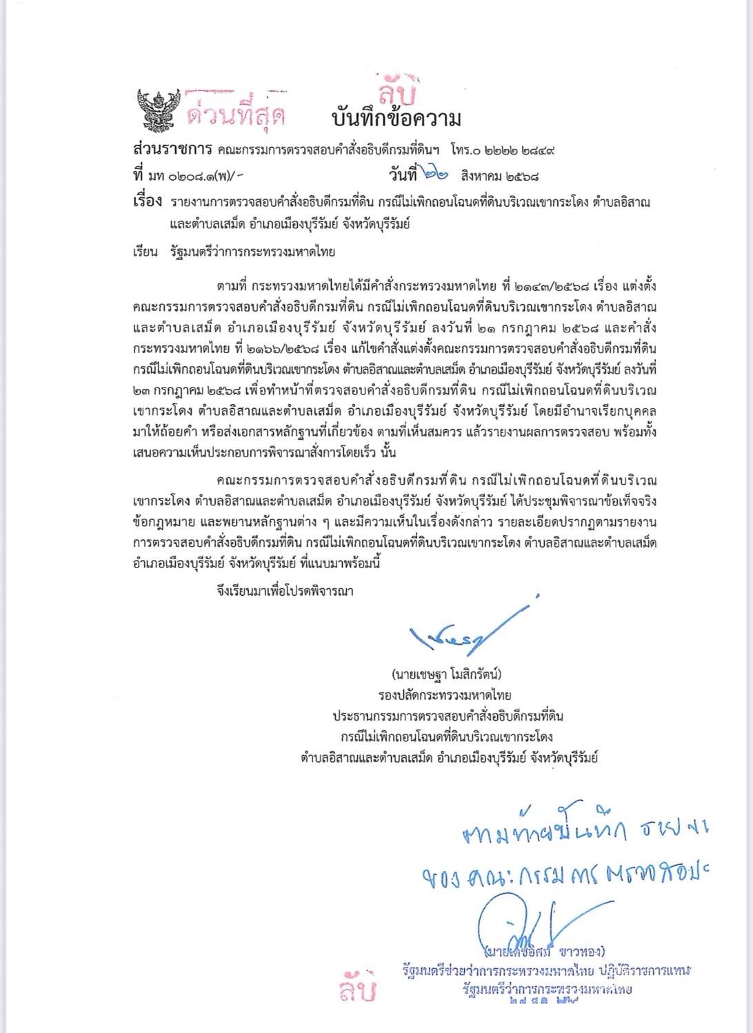 วันที่ 18 ก.ย.2568 ผู้สื่อข่าวรายงานว่า เอกสารบันทึกข้อความลับด่วนที่สุด ที่ มท. 0208.1(พ) เรื่อง รายงานการตรวจสอบคำสั่งอธิบดีกรมที่ดิน กรณีไม่เพิกถอนโฉนดที่ดินบริเวณเขากระโดง ตำบลอิสาณ และตำบลเสม็ด อำเภอบุรีรัมย์ จังหวัดบุรีรัมย์ ที่มี นายเชษฐา โมสิกรัตน์ รองปลัดกระทรวงมหาดไทย ในฐานะประธานตรวจสอบคำสั่งอธิบดีกรมที่ดิน กรณีไม่เพิกถอนโฉนดที่ดินบริเวณเขากระโดง เสนอให้นาย เดชอิศม์ ขาวทอง รมช.มหาดไทย ในยุครัฐบาลที่ผ่านมา ในวันที่ 22 ส.ค. 2568 และนายเดชอิศม์ได้ลงนามรับรองในวันที่ 27 ส.ค. 2568 นอกจากนี้ยังพบการลงนามรับรองผลการตรวจสอบดังกล่าวจากคณะกรรมการคนอื่นๆ ด้วย