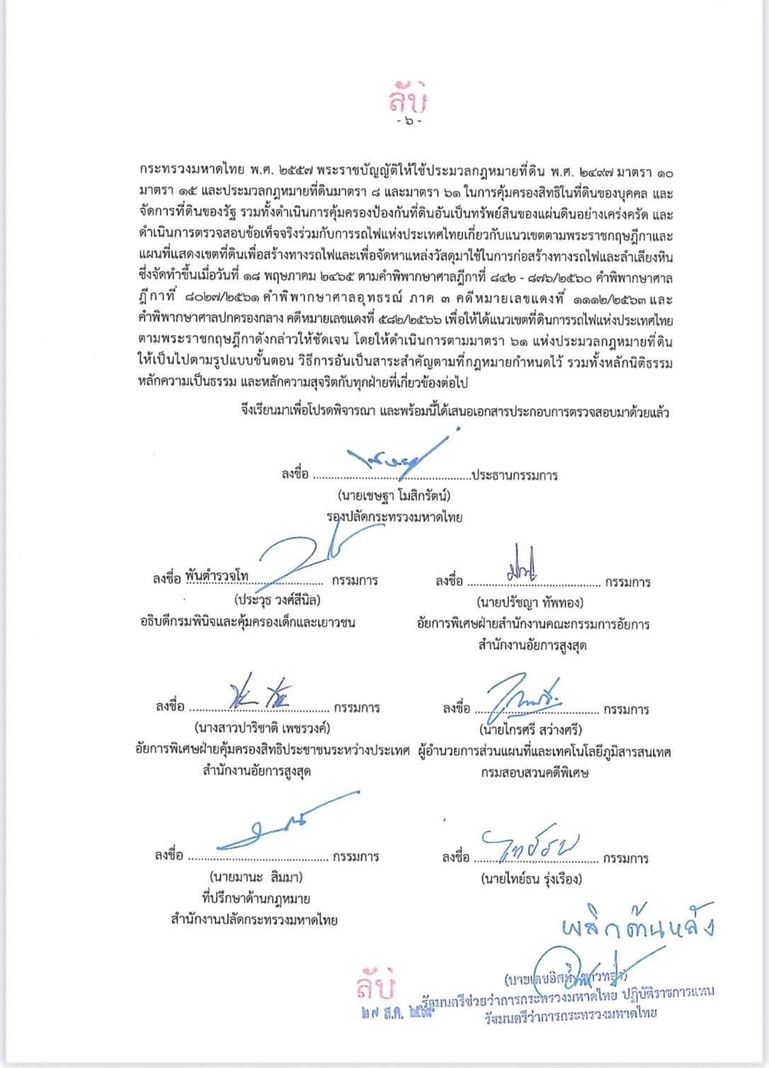 อีกทั้งสาระสำคัญรายงานของคณะกรรมการตรวจสอบการใช้ดุลพินิจของอธิบดีกรมที่ดิน(พรพจน์ เพ็ญพาส อดีตอธิบดีกรมที่ดิน) และ คณะกรรมการตามมาตรา 61 ไม่มีข้อเสนอให้อธิบดีกรมที่ดิน ใช้อำนาจตามมาตรา 61 วรรค 8 เพิกถอนการจดทะเบียน หรือออกเอกสารสิทธิ แต่อย่างใด ซึ่งไม่ตรงกับสาระสำคัญของการแถลงข่าวเมื่อวันที่ 1 สิงหาคม 2568 ที่ให้อธิบดีกรมที่ดิน เพิกถอนการจดทะเบียนหรือออกเอกสารสิทธิ