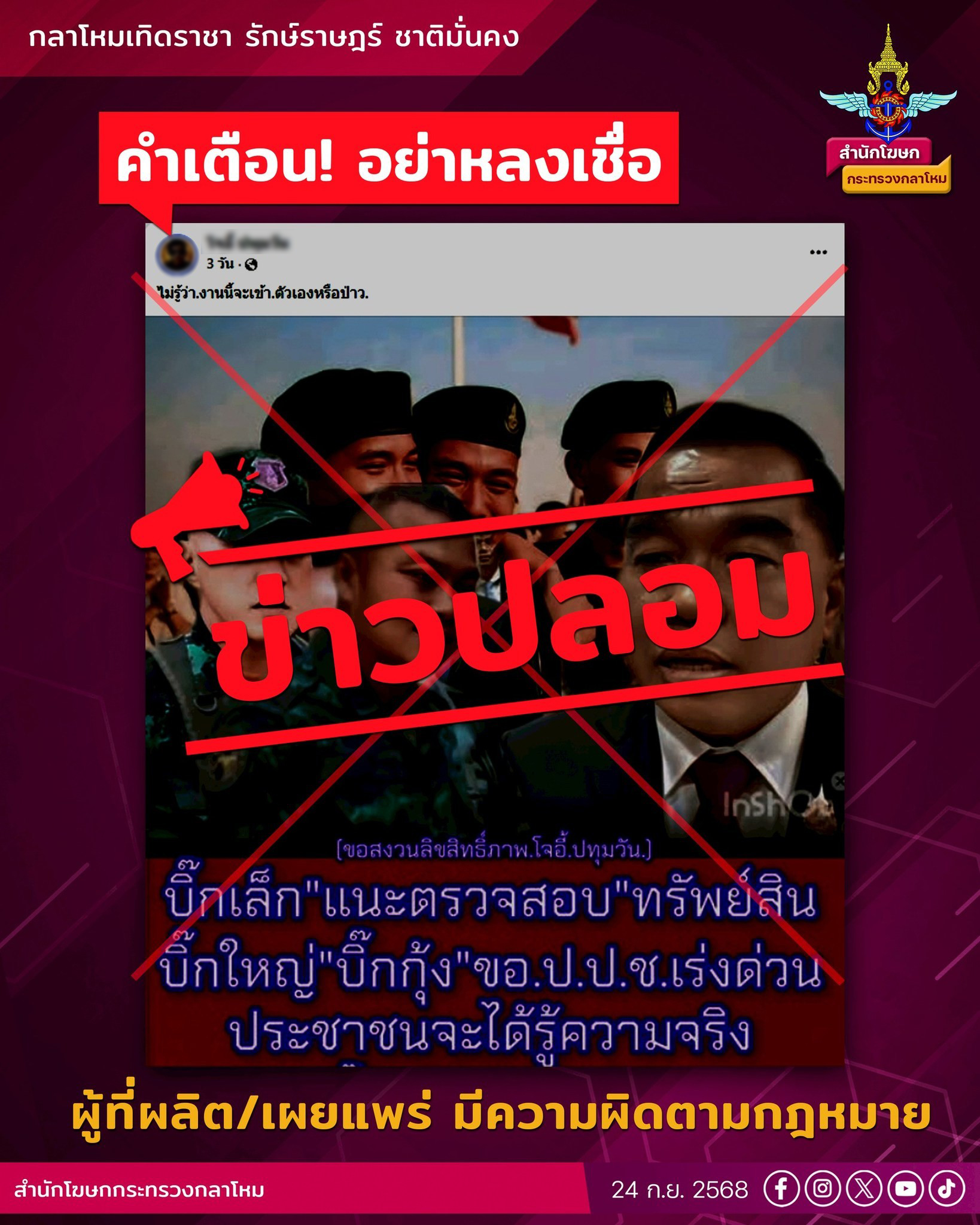 ด้าน สำนักโฆษกกระทรวงกลาโหม เผยได้ดำเนินการตรวจสอบข้อเท็จจริง โดยชี้แจงดังนี้