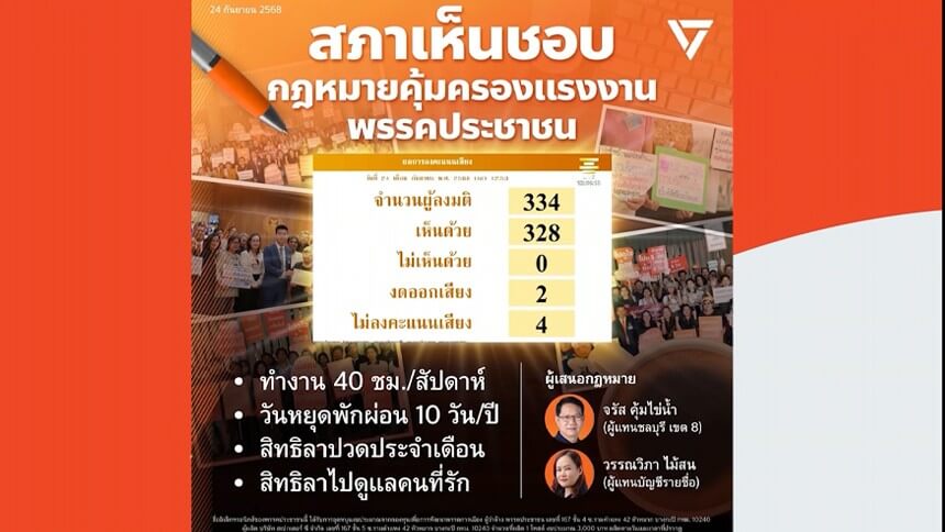 พรรคส้มเฮ สภารับหลักการร่าง พ.ร.บ.คุ้มครองแรงงาน 2 ฉบับ เพิ่มสิทธิประโยชน์ลูกจ้าง ทำงานสัปดาห์ละไม่เกิน 40 ชม. ให้สิทธิลาพักร้อนได้ 10 วันต่อปี ผู้หญิงลาปวดประจำเดือนได้ 3 วันต่อเดือน และลาดูแลคนในครอบครัวลมหายใจสุดท้าย