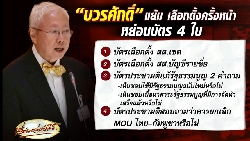 คนไทยพร้อมไหม เลือกตั้งครั้งประวัติศาสตร์ บวรศักดิ์ ชี้แจงรัฐสภาครั้งแรก เผยเลือกตั้งครั้งหน้าหลังยุบสภา ประชาชนกาบัตร 4 ใบ แบ่งเป็น 2 ใบ เลือก สส.เขต-บัญชีรายชื่อ อีก 2 ใบ คำถามประชามติ แก้ รธน. และการยกเลิก MOU ไทย-กัมพูชา