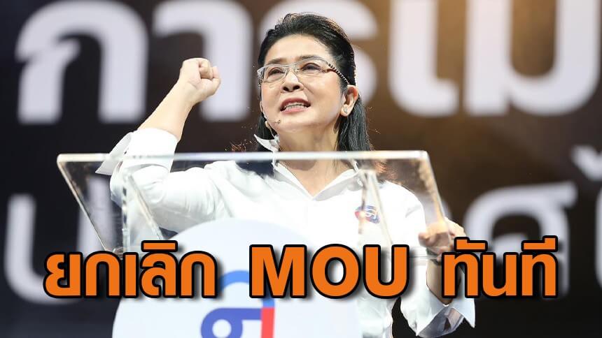 "และหากดิฉันมีโอกาสเป็นนายกรัฐมนตรี ดิฉันจะดำเนินการยกเลิกMOU ทั้งสองฉบับทันที เพื่อยืนยันว่า อธิปไตย และบูรณภาพแห่งดินแดนของไทย คือสิ่งที่ไม่อาจประนีประนอมได้อีกต่อไป ”