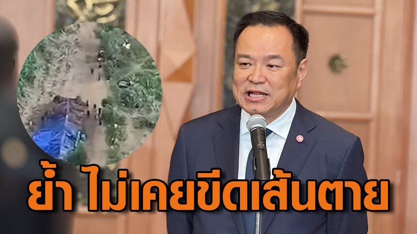 “อนุทิน” ย้ำ ไม่เคยขีดเส้นตาย ผลักดัน “ชาวกัมพูชา” ออกจากพื้นที่ บ้านหนองจาน จ.สระแก้ว ชี้ รัฐบาลมีหน้าที่สนับสนุน กองทัพ – กระทรวงการต่างประเทศใช้อำนาจตามกรอบเพื่อบรรลุเป้าหมาย ยัน พยายามทำให้บรรยากาศในพื้นที่ละมุนละม่อมที่สุด เลี่ยงการปะทะ แต่ต้องรักษาไว้ซึ่งเกียรติภูมิ และรักษาอธิปไตยของไทย