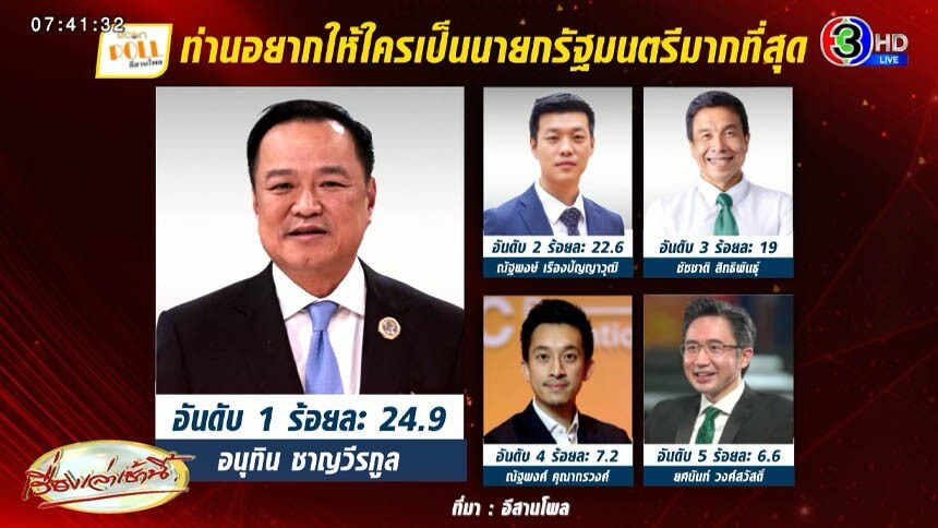 อันดับ 1 ร้อยละ 24.3 ระบุว่า อนุทิน ชาญวีรกูล