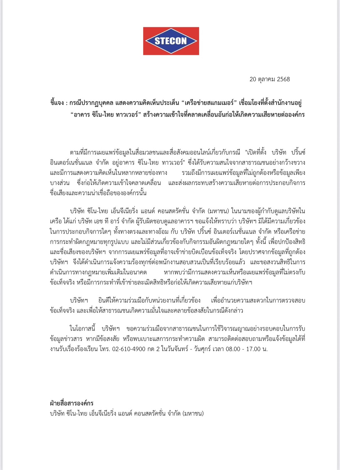 ฝ่ายสื่อสารองค์กร บริษัท ซีโน-ไทย เอ็นจีเนียริ่ง แอนด์ คอนสตรัคชั่น จำกัด (มหาชน) ออกเอกสารชี้แจงกรณีปรากฏบุคคล แสดงความคิดเห็นประเด็น "เครือข่ายสแกมเมอร์" เชื่อมโยงที่ตั้งสำนักงานอยู่ "อาคาร ชิโน-ไทย ทาวเวอร์" สร้างความเข้าใจที่คลาดเคลื่อนอันก่อให้เกิดความเสียหายต่อองค์กร