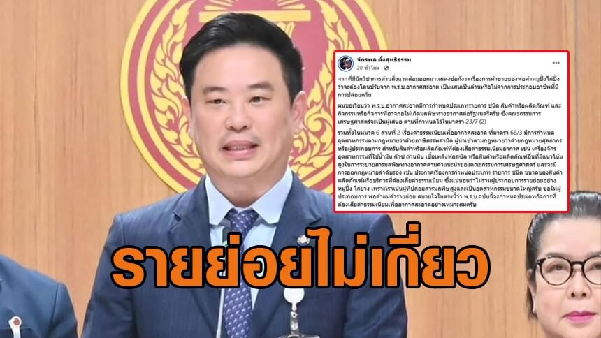 รายย่อยไม่เกี่ยว! 'จักรพล' แจงข่าว พ่อค้าหมูปิ้งไก่ย่าง ต้องโดนปรับจาก พ.ร.บ.อากาศสะอาด เป็นแสนเป็นล้าน จากการประกอบอาชีพปล่อยควัน ยันกฎหมายไม่รวมผู้ประกอบการรายย่อย อย่างหมูปิ้ง ไก่ย่าง เพราะเน้นผู้ปล่อยสารมลพิษสูง และอุตสาหกรรมขนาดใหญ่