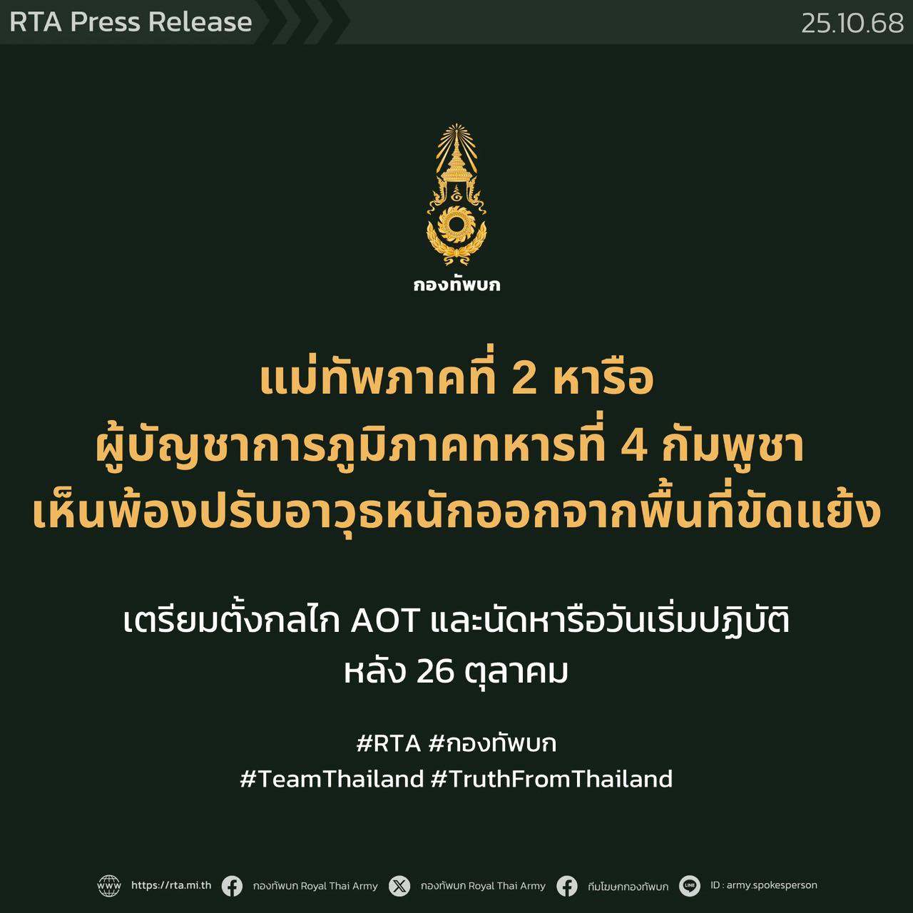 แม่ทัพภาคที่ 2 หารือผู้บัญชาการภูมิภาคทหารที่ 4 กัมพูชา เห็นพ้องปรับอาวุธหนักออกจากพื้นที่ขัดแย้ง สร้างเสถียรภาพชายแดน เตรียมตั้งกลไก AOT และนัดหารือวันเริ่มปฏิบัติอีกครั้งหลัง 26 ตุลาคมนี้