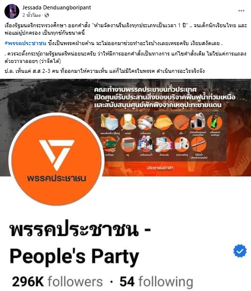 โดยได้โพสต์รูปโปรไฟล์พรรคประชาชน พร้อมระบุข้อความว่า เรื่องรัฐมนตรีกระทรวงศึกษา ออกคำสั่ง "ห้ามจัดงานรื่นเริงทุกประเภทเป็นเวลา 1 ปี" .. จนเด็กนักเรียนไทย และพ่อแม่ผู้ปกครอง เป็นทุกข์กันขนาดนี้ พรรคประชาชน ซึ่งเป็นพรรคฝ่ายค้าน จะไม่ออกมาช่วยทำอะไรบ้างเลยเหรอครับ เงียบสงัดเลย ควรจะตั้งกระทู้ถามรัฐมนตรีหน่อยนะครับ ว่าให้มีการออกคำสั่งเป็นทางการ แก้ไขคำสั่งเดิม ไม่ใช่แค่การแถลงด้วยวาจาลอยๆ (ว่าจัดได้) ปล. เห็นแค่ ส.ส 2-3 คน ที่ออกมาให้ความเห็น แต่ก็ไม่มีใครในพรรค ดำเนินการอะไรจริงจัง