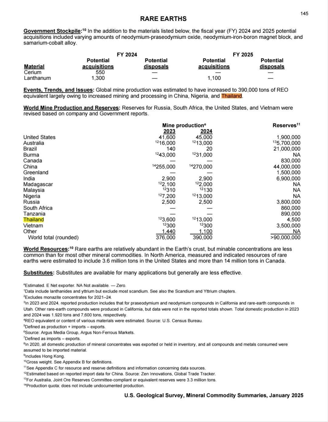 29 ต.ค. 2568 นายฟูอาดี้ พิศสุวรรณ อดีตที่ปรึกษาด้านต่างประเทศ พรรคก้าวไกล โพสต์เอกสารและข้อความบนเฟซบุ๊ก ถึงการทำแร่แรร์เอิร์ธ ว่า ข้อมูลจาก USGS (สำนักงานสำรวจธรณีวิทยาแห่งสหรัฐอเมริกา) ระบุว่า ไทยมีสำรองแร่หายาก (rare earth reserves) อยู่ราว 4,500 ตัน แต่ในปีที่ผ่านมา เรากลับผลิตได้ถึง 13,000 ตัน ซึ่งทำให้ไทยเป็นประเทศเดียวที่มีตัวเลข “ไม่สมดุล” แบบนี้นั่นหมายความว่าอะไร