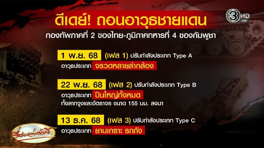 กองทัพภาค ไทย-กัมพูชา ดีเดย์ ถอนอาวุธชายแดนเฟสแรกเที่ยงคืน 1 พ.ย. เริ่มที่จรวดหลายลำกล้อง BM-21 เฟส 2 ปืนใหญ่ขนาด 155 ม. ภายใน 3 สัปดาห์ เฟส 3 ยานเกราะ รถถัง ภายใน 6 สัปดาห์ แม่ทัพภาค 2 ชาติ เตรียมลงนามร่วมกัน 31 ต.ค.