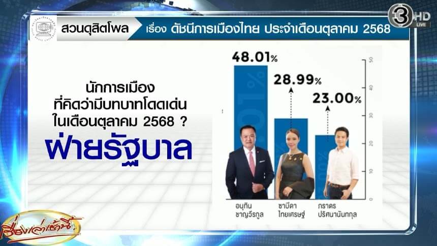 สวนดุสิตโพล เผย 'อนุทิน-ไอซ์ รักชนก' ดาวเด่น คนชื่นชอบ 'คนละครึ่งพลัส'