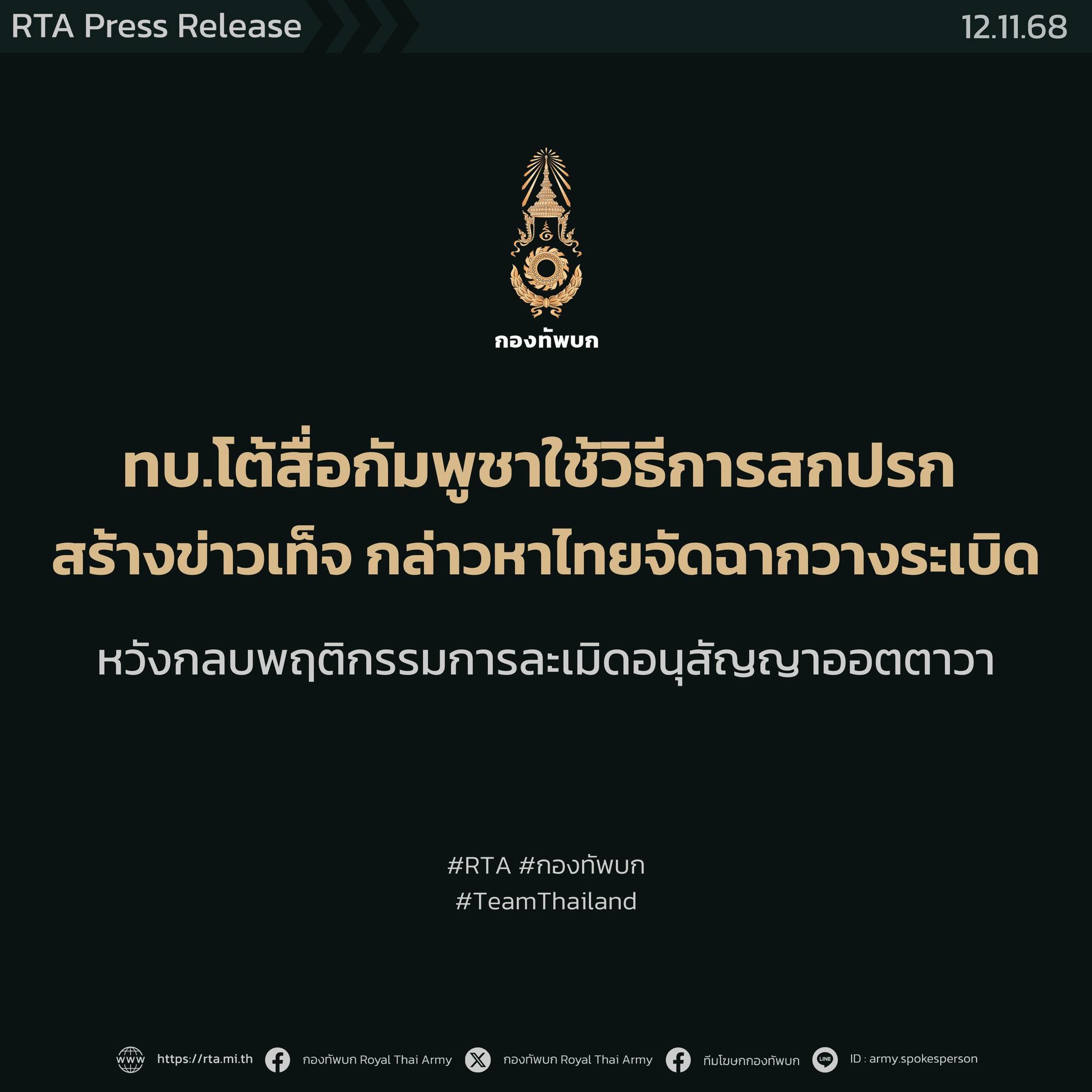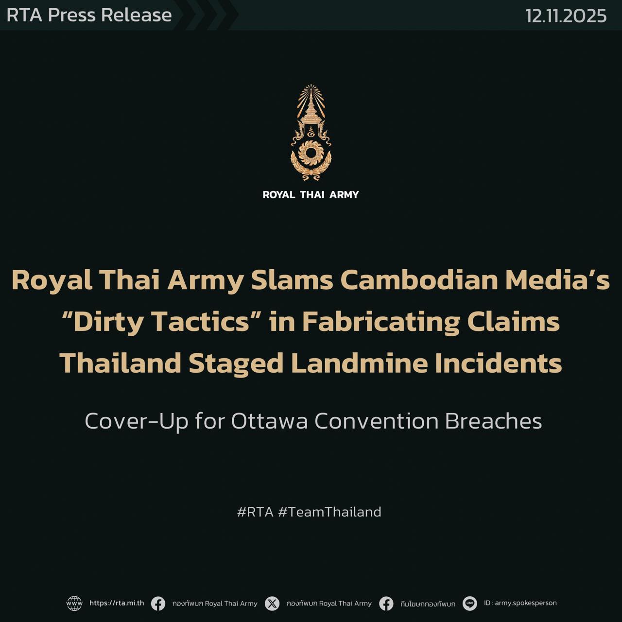 วันที่ 12 พ.ย.2568 เฟซบุ๊กเพจ ทีมโฆษกกองทัพบก Army Spoke Team โพสต์ข้อความ กองทัพบกยืนยันสื่อกัมพูชาใช้วิธีการสกปรกเดิมๆ ในการสร้างข่าวเท็จ กล่าวหาไทย “จัดฉากวางระเบิดให้กำลังพลตัวเองรับเคราะห์” หวังกลบพฤติกรรมการละเมิดอนุสัญญาออตตาวาของกัมพูชาเอง