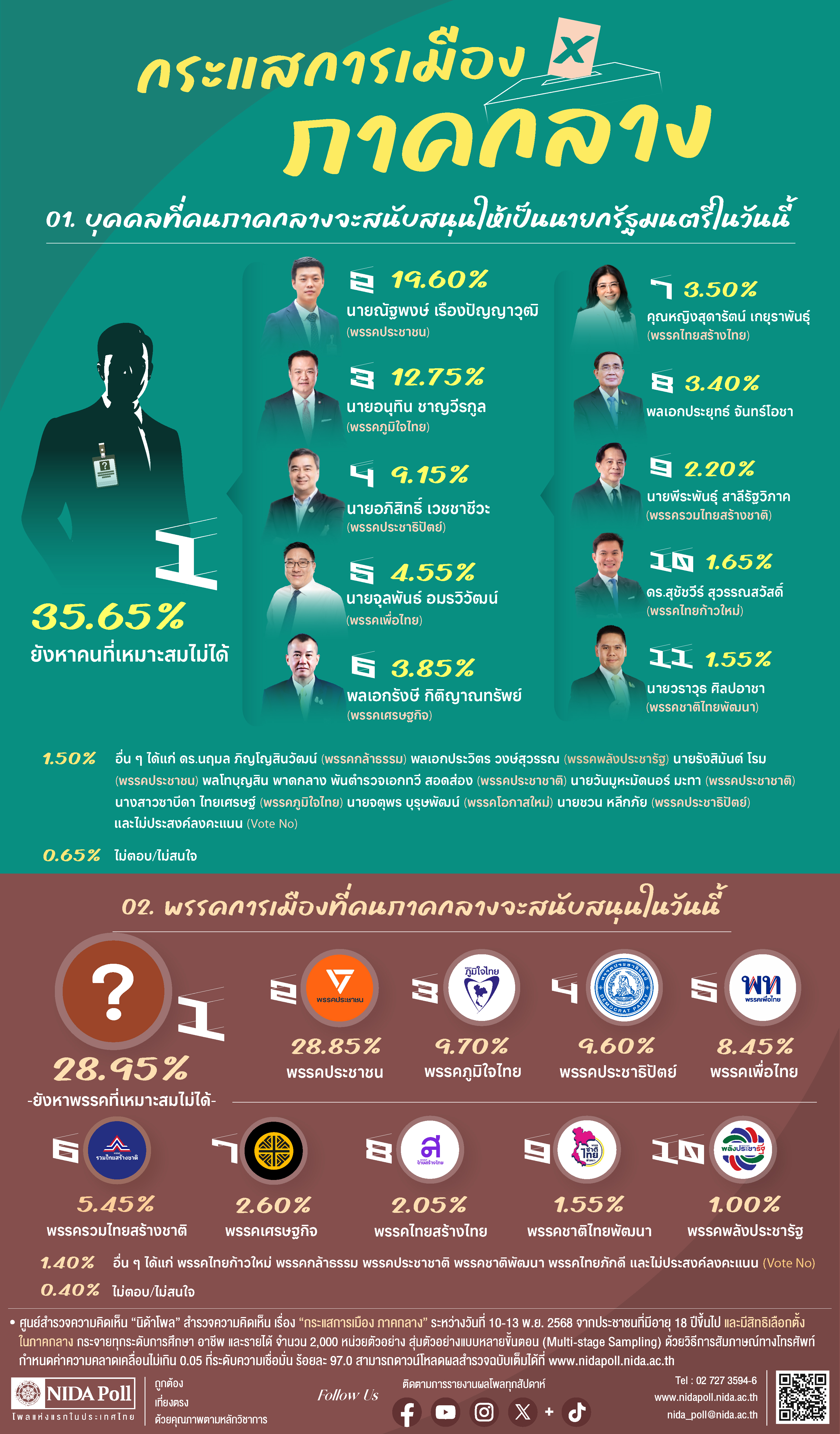 ศูนย์สำรวจความคิดเห็น “นิด้าโพล” สถาบันบัณฑิตพัฒนบริหารศาสตร์ (นิด้า) เปิดเผยผลการสำรวจ เรื่อง “กระแสการเมือง ภาคกลาง” ทำการสำรวจระหว่างวันที่ 10 - 13 พฤศจิกายน 2568 จากประชาชนที่มีอายุ 18 ปีขึ้นไป และมีสิทธิเลือกตั้งในภาคกลาง (จำนวน 17 จังหวัด ประกอบด้วย ชัยนาท พระนครศรีอยุธยา ลพบุรี สระบุรี สิงห์บุรี อ่างทอง นนทบุรี ปทุมธานี นครปฐม สมุทรปราการ กาญจนบุรี ราชบุรี สุพรรณบุรี ประจวบคีรีขันธ์ เพชรบุรี สมุทรสงคราม และสมุทรสาคร อ้างอิงตามประกาศคณะกรรมการนโยบายการบริหารงานจังหวัดและกลุ่มจังหวัดแบบบูรณาการเรื่อง การจัดตั้งกลุ่มจังหวัดและกำหนดจังหวัดที่เป็นศูนย์ปฏิบัติการของกลุ่มจังหวัด (ฉบับที่ 3) (2560, 17 พฤศจิกายน) ราชกิจจานุเบกษา. เล่มที่ 134 [ตอนพิเศษ 281 ง]. หน้า [14]) กระจายทุกระดับการศึกษา อาชีพ และรายได้ รวมจำนวนทั้งสิ้น 2,000 หน่วยตัวอย่าง เกี่ยวกับกระแสการเมือง ภาคกลาง การสำรวจอาศัยการสุ่มตัวอย่างโดยใช้ความน่าจะเป็นจากบัญชีรายชื่อฐานข้อมูลตัวอย่างหลัก (Master Sample) ของ “นิด้าโพล” สุ่มตัวอย่างแบบหลายขั้นตอน (Multi-stage Sampling) เก็บข้อมูลด้วยวิธีการสัมภาษณ์ทางโทรศัพท์ โดยกำหนดค่าความคลาดเคลื่อนไม่เกิน 0.05 ที่ระดับความเชื่อมั่น ร้อยละ 97.0