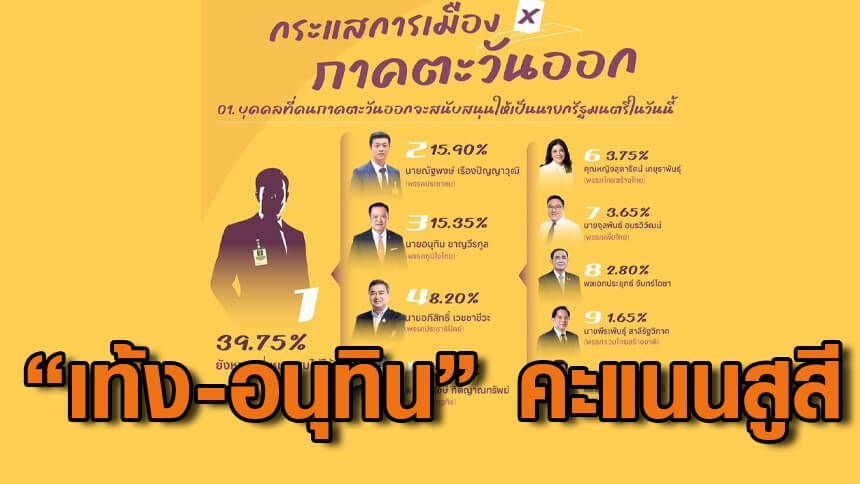 จากการสำรวจเมื่อถามถึงบุคคลที่คนภาคตะวันออก จะสนับสนุนให้เป็นนายกรัฐมนตรีในวันนี้ พบว่า