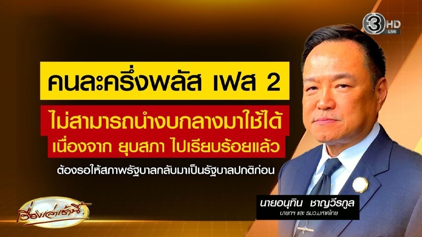 ดับฝัน! คนละครึ่งพลัส เฟส 2 'อนุทิน' ลั่นใช้งบกลางไม่ได้ ต้องรอรัฐบาลปกติ
