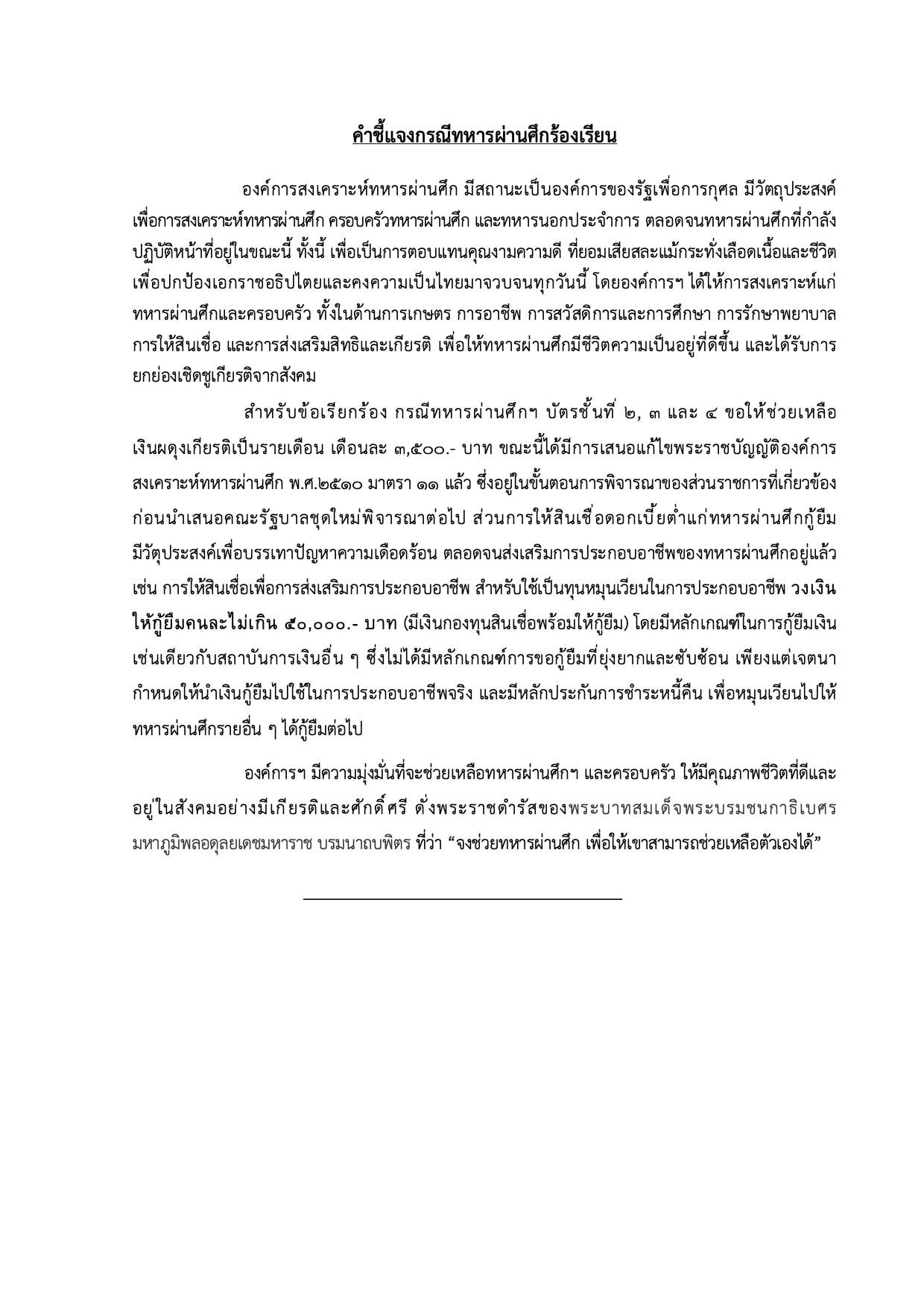 สำหรับข้อเรียกร้อง กรณีทหารผ่านศึกๆ บัตรชั้นที่ 2 ,3 และ4 ขอให้ช่วยเหลือเงินผดุงเกียรติเป็นรายเดือน เดือนละ 3,500 บาท ขณะนี้ได้มีการเสนอแก้ไขพระราชบัญญัติองค์การสงเคราะห์ทหารผ่านศึก พ.ศ.2510 มาตรา 11 แล้ว ซึ่งอยู่ในขั้นตอนการพิจารณาของส่วนราชการที่เกี่ยวข้อง ก่อนนำเสนอคณะรัฐบาลชุดใหม่พิจารณาต่อไป