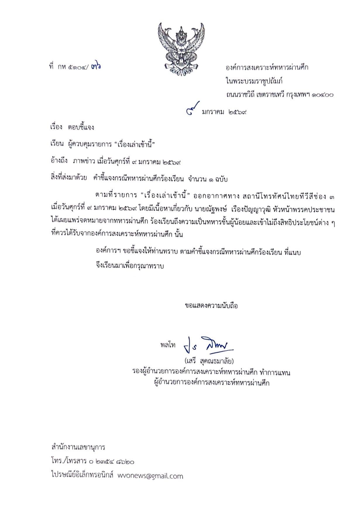 พลโทเสรี สุคณธมาลัย รองผู้อำนวยการองค์การสงเคราะห์ทหารผ่านศึก ทำการแทนผู้อำนวยการองค์การสงเคราะห์ทหารผ่านศึก ทำหนังสือถึงรายการเรื่องเล่าเช้านี้ ชี้แจงกรณีนายณัฐพงษ์ เรืองปัญญาวุฒิ หัวหน้าพรรคประชาชนได้เผยแพร่จดหมายจากทหารผ่านศึก ร้องเรียนถึงความเป็นทหารชั้นผู้น้อย และเข้าไม่ถึงสิทธิประโยชน์ต่าง ๆ ที่ควรได้รับจากองค์การทหารผ่านศึก