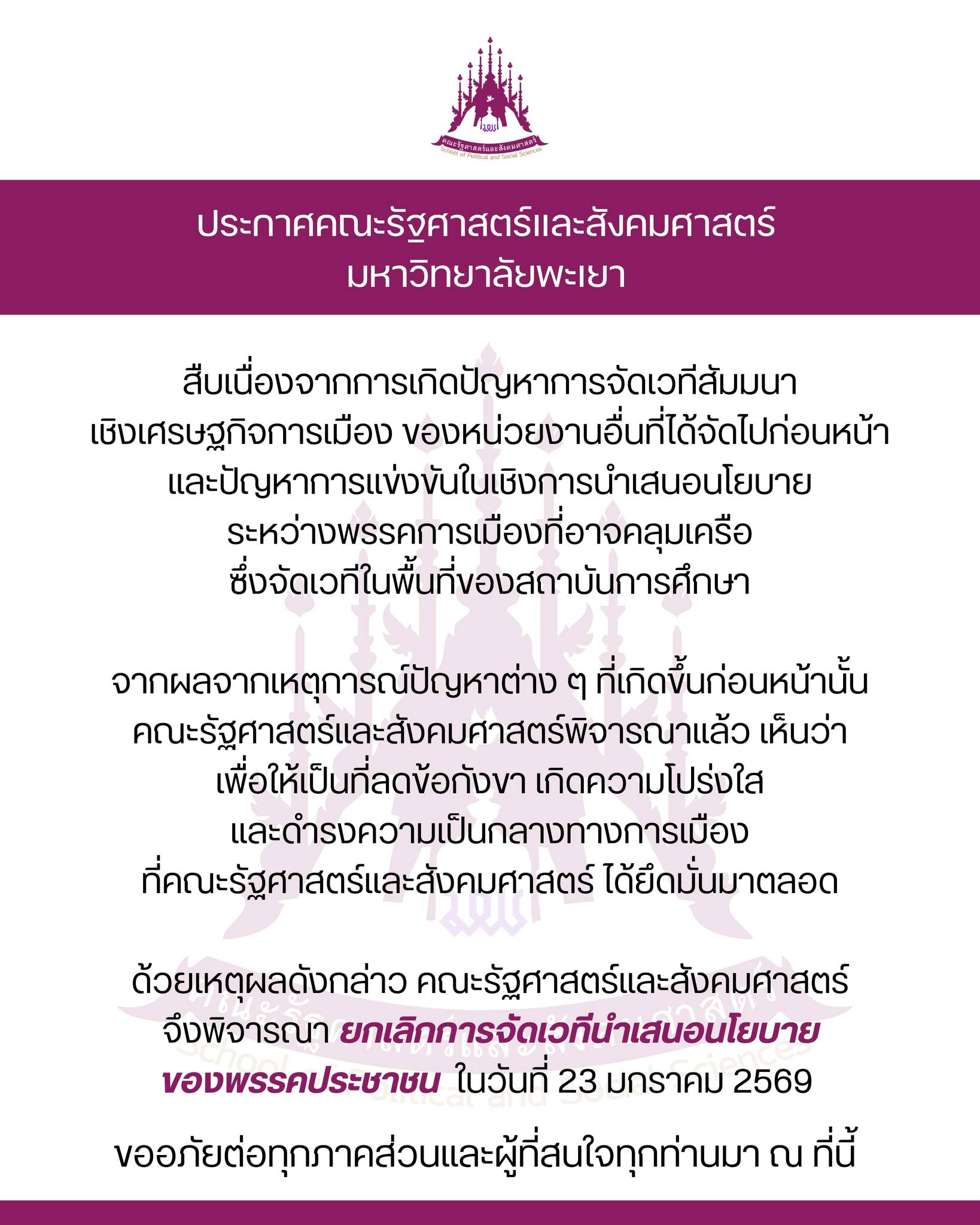 คณะรัฐศาสตร์และสังคมศาสตร์พิจารณาแล้ว เห็นว่าเพื่อให้เป็นที่ลดข้อกังขา เกิดความโปร่งใสและดำรงความเป็นกลางทางการเมืองที่คณะรัฐศาสตร์และสังคมศาสตร์ ได้ยึดมั่นมาตลอด ด้วยเหตุผลดังกล่าว คณะรัฐศาสตร์และสังคมศาสตร์ จึงพิจารณา ยกเลิกการจัดเวทีนำเสนอ นโยบายของพรรคประชาชน ในวันที่ 23 มกราคม 2569