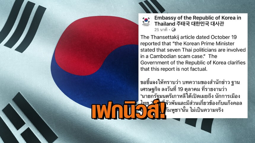 สถานทูตเกาหลีใต้ แจงไม่เป็นความจริง ข่าว 7 นักการเมืองไทย เอี่ยวสแกมเมอร์เขมร