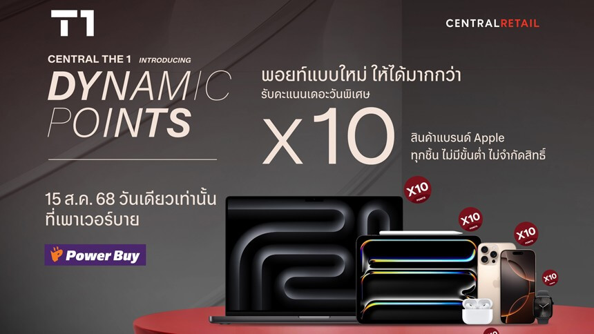 กรุงเทพฯ – 13 สิงหาคม 2568 : บัตรเครดิต เซ็นทรัล เดอะวัน ชวนช้อปสุดคุ้มกับ “T1 Dynamic Points พอยท์แบบใหม่ ให้ได้มากกว่า” พิเศษสุด 15 สิงหาคม 2568 วันเดียวเท่านั้น รับคะแนนเดอะวันพิเศษ 10 เท่า เมื่อช้อปสินค้าแบรนด์ Apple ทุกประเภท ไม่จำกัดสิทธิ์ ที่ร้านเพาเวอร์บายสาขาที่ร่วมรายการ (จำกัดคะแนนเดอะวันพิเศษสูงสุด 24,000 คะแนนต่อหมายเลขบัตรหลัก ตลอดรายการ - เงื่อนไขเป็นไปตามที่กำหนด) ทั้งนี้ สมาชิกบัตรสามารถติดตามสินค้าที่ร่วมรายการและมอบคะแนนเดอะวันพิเศษของรายการ T1 Dynamic Points ในรอบอื่น ๆ ในทุกวันที่ 15 ของเดือน จากสื่อประชาสัมพันธ์ของบริษัท ข้อมูลเพิ่มเติมและรายละเอียด Dynamic Points ได้ที่ www.centralthe1card.com ทั้งนี้ ใช้เท่าที่จำเป็นและชำระคืนได้เต็มจำนวนตามกำหนด จะได้ไม่เสียดอกเบี้ย 16% ต่อปี