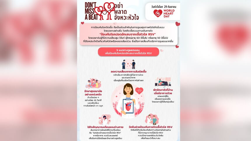 ประเทศไทยพบผู้ป่วยสะสมด้วยโรคหัวใจและหลอดเลือดมากกว่า 2.5 แสนราย และเสียชีวิต ด้วยโรคหัวใจและหลอดเลือดมากถึง 4 หมื่นราย เฉลี่ยชั่วโมงละ 5 คน โดยหนึ่งในผลกระทบที่หลายคนอาจไม่เคยรู้ คือ ผู้ป่วยในจำนวนนี้มีล้วนมีความเสี่ยงต่อการติดเชื้อทางเดินหายใจที่รุนแรงขึ้น เช่น โรคปอดอักเสบจากไวรัสอาร์เอสวี อาร์เอสวีเป็นไวรัสในระบบทางเดินหายใจที่พบได้บ่อยและสามารถป้องกันได้ด้วยวัคซีน อาจก่อให้เกิดอาการที่รุนแรงมากขึ้นในผู้ที่เป็นโรคหัวใจและหลอดเลือด วันหัวใจโลกจึงเป็นการตอกย้ำเพื่อสร้างความตระหนักถึงความเสี่ยงและการดูแลสุขภาพเชิงรุกเพื่อปกป้องสุขภาพหัวใจของทุกคนเพื่อให้หัวใจ ไม่พลาดจังหวะ (Don’t Miss a Beat)