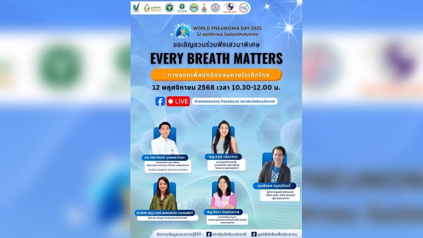 สถาบันวัคซีนแห่งชาติ จึงร่วมกับ มูลนิธิวัคซีนเพื่อประชาชน กรมควบคุมโรค ราชวิทยาลัยกุมารแพทย์แห่งประเทศไทย สมาคมกุมารแพทย์แห่งประเทศไทย และสมาคมโรคติดเชื้อในเด็กแห่งประเทศไทย จัดงาน World Pneumonia Day 2025 - Stop Pneumonia, Save Lives เด็กไทยต้องปลอดภัยจากโรคร้ายที่ป้องกันได้ด้วยวัคซีน" เพื่อรณรงค์สร้างความตระหนักรู้ถึงความรุนแรงของโรคปอดอักเสบและความสำคัญของการเข้าถึงวัคซีนป้องกันโรคปอดอักเสบในเด็กเล็ก เพื่อให้ “ทุกลมหายใจของเด็กไทย” เติบโตไปอย่างปลอดภัยและแข็งแรง และไม่ต้องเสี่ยงกับโรคที่ป้องกันได้ด้วยวัคซีน เนื่องในวันปอดอักเสบสากล ในวันที่ 12 พฤศจิกายน 2568 เวลา 09.00-12.00น. ณ ห้องออดิทอเรียม ชั้น 6 อาคารปฏิบัติการวิทยุโทรทัศน์ บริษัท อสมท จำกัด (มหาชน)