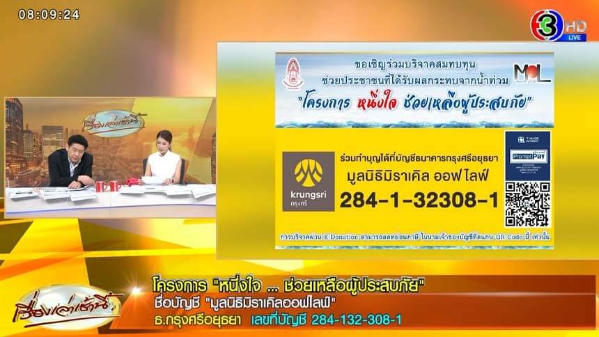 สภาสังคมสงเคราะห์แห่งประเทศไทย ในพระบรมราชูปถัมภ์ ร่วมกับ มูลนิธิมิราเคิล ออฟไลฟ์ จัดโครงการ หนึ่งใจ...ช่วยเหลือผู้ประสบภัย ชวนคนไทยร่วมบริจาคสมทบทุนช่วยเหลือผู้ประสบอุทกภัย