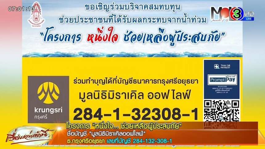โครงการ 'หนึ่งใจ...ช่วยเหลือผู้ประสบภัย' ชวนร่วมบริจาคสมทบทุน ช่วยเหลือผู้ประสบอุทกภัย