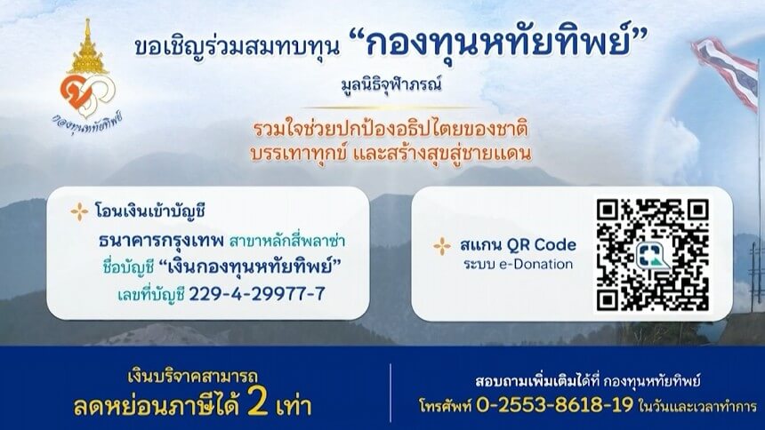 คณะกรรมการบริหารกองทุนหทัยทิพย์ ขอเชิญพี่น้องประชาชนจากทุกภาคส่วนร่วมเป็นส่วนหนึ่งในการแสดงพลังปกป้องอธิปไตยของชาติ เพื่อการบรรเทาทุกข์และสร้างประโยชน์สุขสู่ประชาชนในพื้นที่ชายแดนอย่างยั่งยืน
