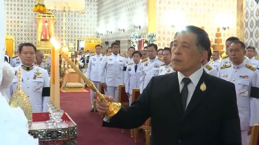 จากนั้น ทรงจุดธูปเทียนเครื่องนมัสการพานทองสองชั้นบูชาพระพุทธรูปประจำพระชนมวาร ที่หน้าพระแท่นพระนพปฎลมหาเศวตฉัตร ทรงจุดธูปเทียนเครื่องบูชากระบะมุก ที่แท่นเตียงพระพิธีธรรมสวดพระอภิธรรม แล้วทรงทอดผ้าไตร ทรงหลั่งทักษิโณทก พระสงฆ์ถวายอนุโมทนา ถวายอดิเรก