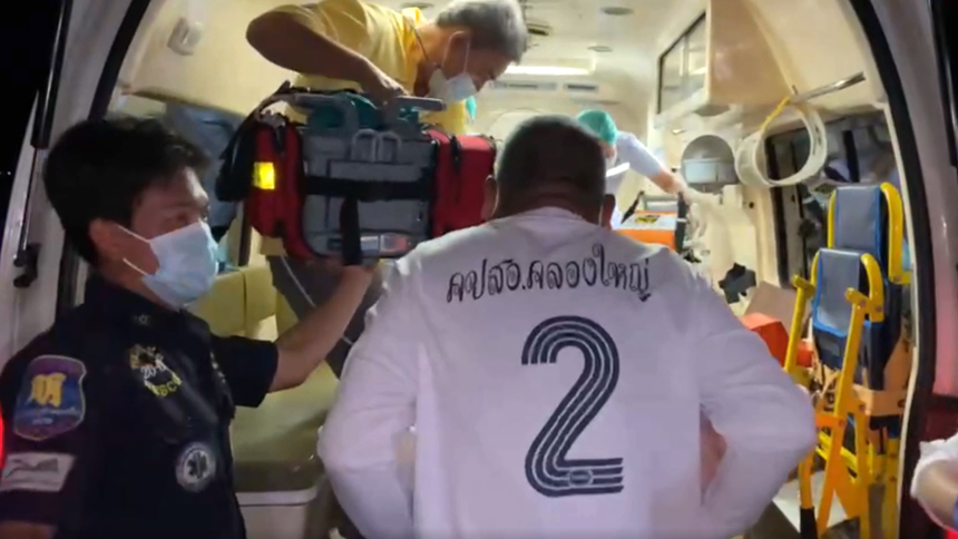 พร้อมกับเร่งนำตัวเดินทางด้วยเรือ ต.230 ฝ่ากระแสคลื่นลมแรง ทำให้ต้องเดินเรือด้วยความล่าช้า เพราะเป็นเวลากลางคืนด้วย โดยทีมแพทย์ต้องเร่งช่วยยื้อชีวิต Mr.Thiele, Bernd Joachim Max มาตลอดทาง ใช้เวลาเดินทางนานเกือบ 2 ชม. จนถึงฝั่งท่าเทียบเรืออเนกประสงค์อำเภอคลองใหญ่ นำส่งรพ.คลองใหญ่ให้การรักษาเป็นการเร่งด่วน