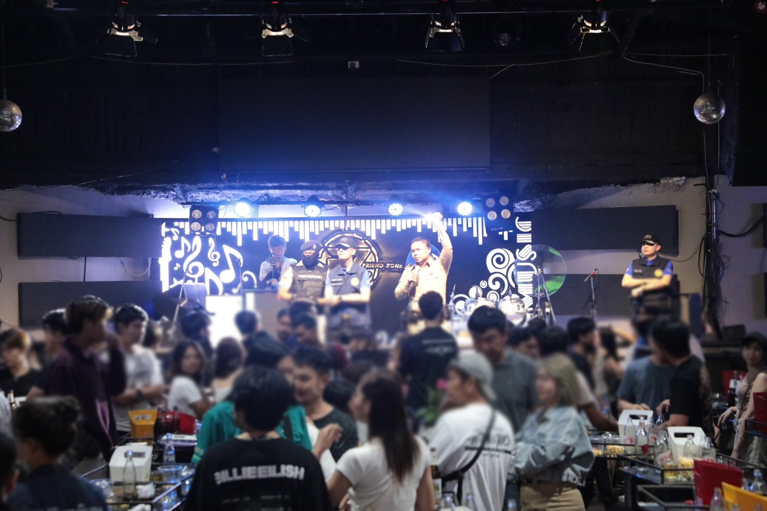 กระทั่งเวลา 01.30 น. วันที่ 9 มี.ค. 2567 เปิดปฏิบัติการเข้าจับกุมสถานบันเทิงละเมิดกฎหมายทันที เมื่อชุดจับกุมเข้าไปถึงภายในสถานบริการซึ่งกำลังทำการแสดงดนตรีสด พบนักเที่ยวภายในสถานบริการจำนวนมากกว่า 300 คน กำลังเมามันส์กับการแสดงดนตรีสด นักเที่ยวเกิดความแตกตื่นเมื่อเจ้าหน้าที่ชุดจับกุมเข้าควบคุมพื้นที่ ชุดจับกุมได้ปิดล้อมประตูไว้ทุกด้าน จึงทำให้นักเที่ยวไม่สามารถหนีออกไปได้ พนักงานฝ่ายปกครองได้ประกาศให้ทุกคนอยู่ในความสงบ