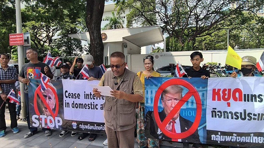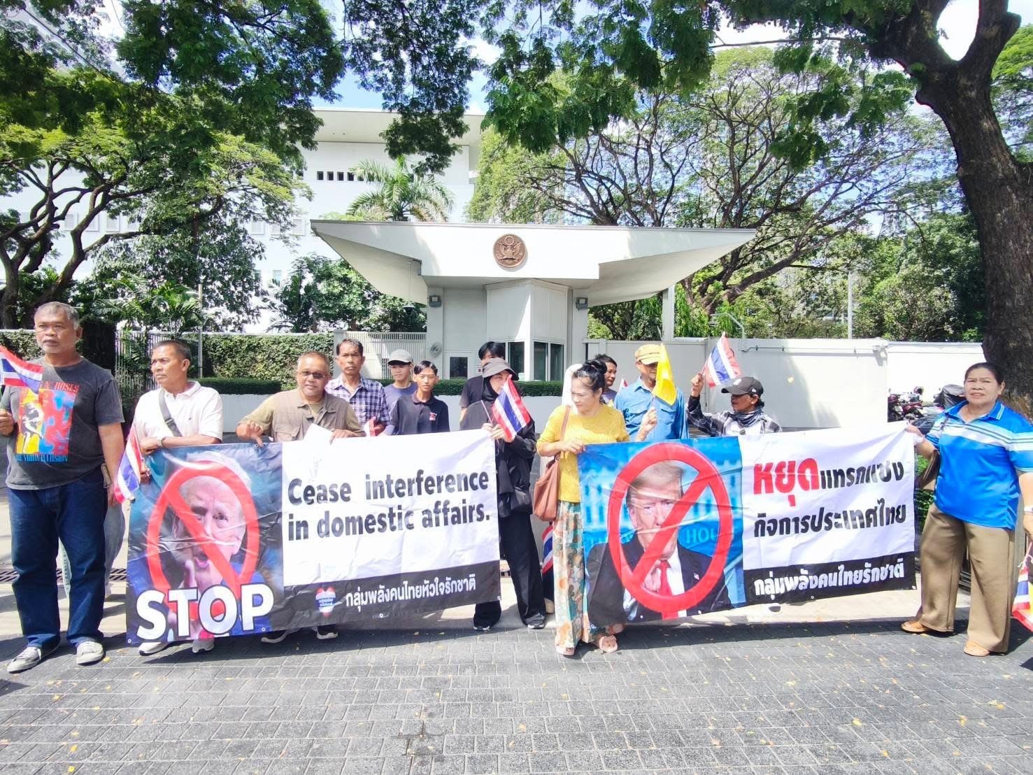 ขณะที่เรื่องนี้กลุ่ม “กลุ่มคนไทยหัวใจรักชาติ” จำนวนประมาณ 50 คน เดินทางไปชุมนุมหน้าสถานเอกอัครราชทูตสหรัฐอเมริกาประจำประเทศไทย ถนนวิทยุ เขตปทุมวัน เพื่อยื่นหนังสือถึงประธานาธิบดีโดนัลด์ ทรัมป์ เรียกร้องให้ยุติการแทรกแซงกิจการภายในของไทย โดยเฉพาะปัญหาความขัดแย้งชายแดนระหว่างไทยกับกัมพูชา พร้อมอ่านจดหมายเปิดผนึก ระบุว่า ความขัดแย้งเรื่องเส้นเขตแดนระหว่างไทยและกัมพูชาเป็นปัญหาที่ละเอียดอ่อนและดำเนินการเจรจากันมาอย่างต่อเนื่องในหลายระดับ ตั้งแต่ระดับรัฐบาล ระดับความมั่นคง จนถึงระดับท้องถิ่น ซึ่งครอบคลุมกลไกแก้ไขปัญหาอย่างเป็นระบบอยู่แล้ว การเข้ามามีบทบาทของประเทศที่สามจะไม่เพียงไม่ช่วยคลี่คลายสถานการณ์ แต่ยังอาจทำให้ความตึงเครียดเพิ่มมากขึ้น