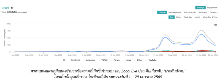 บริษัท ไวซ์ไซท์ (ประเทศไทย) ได้ทำการเก็บข้อมูลที่เกี่ยวข้องผ่านเครื่องมือ Zocial Eye ระหว่างวันที่ 1 – 29 มกราคม 2569 พบว่ามีข้อความพูดถึงประกันสังคมโดยรวมกว่า 418,614 ข้อความ และมียอดเอนเกจเมนต์สูงถึง 36,504,629 เอนเกจเมนต์