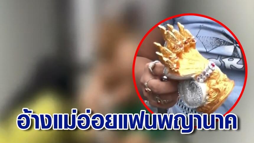 จากนั้นตำรวจได้ไปเคาะห้อง พบตัวลูกสาวที่ก่อเหตุอยู่ในห้อง พอเอาคลิปให้ดูก็ยอมรับว่าทำร้ายแม่จริง เพราะไม่ชอบแม่ เกลียดแม่ แม่ทำของใส่แฟนเธอ แก้ผ้าอ่อยแฟนเธอ เมื่อถามว่าแฟนเป็นใคร เธอบอกว่าแฟนคือรูปปั้นพญานาค ชื่อ สุวรรณนาคราช อายุ 38 ปี ที่เธอซื้อผ่านออนไลน์มาเมื่อ 3 ปีที่แล้ว และก่อนหน้านี้เคยโมโหแม่ จนเอากรรไกรแทงหลังจนได้รับบาดเจ็บมาแล้ว
