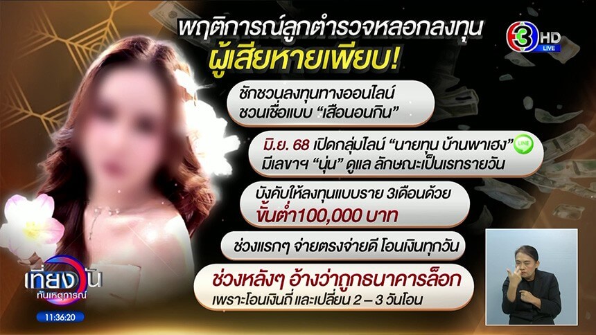 ผู้เสียหายถูกอินฟลูเอนเซอร์สาว ลูกนายตำรวจโปรไฟล์ดี หลอกชักชวนลงทุนปล่อยกู้ได้ดอกเบี้ยสูง จนมีผู้หลงเชื่อ ร่วมลงทุนเกือบ 200 คน เพราะมูลค่าความเสียหายร่วม 100 ล้านบาท สุดท้ายไม่ได้ทั้งต้นและดอกเบี้ยคืน