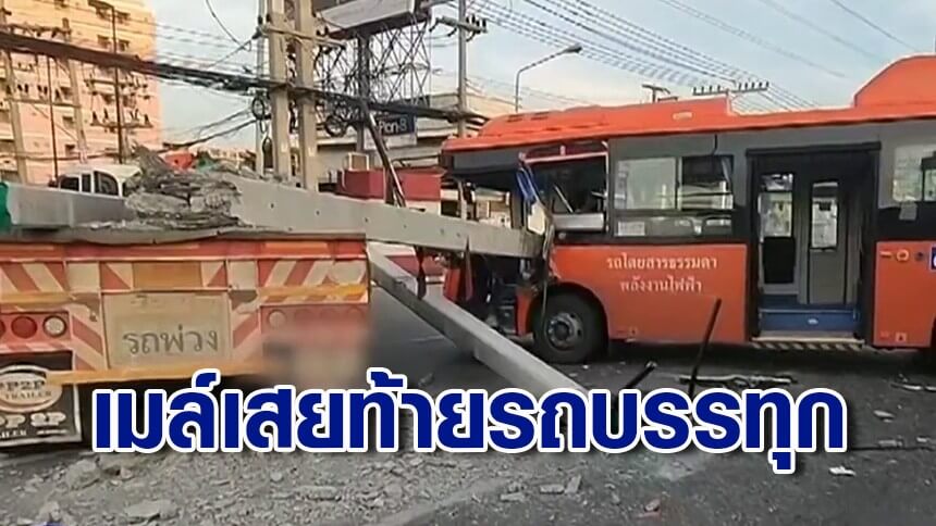 ระทึก! รถเมล์พุ่งเสยท้ายรถบรรทุกเสาเข็ม ทะลุห้องโดยสารพังยับ เจ็บ 2 ราย