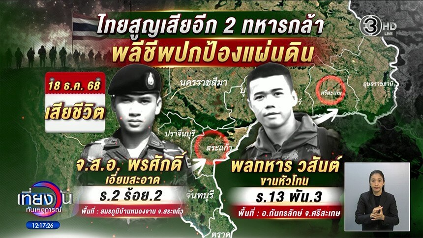 สถานการณ์ชายแดนไทย-กัมพูชา ที่ยังปะทะกันอย่างหนักต่อเนื่อง ล่าสุดไทย ต้องสูญเสียทหารกล้าอีก 2 นาย ทำให้รวมตอนนี้ มีทหารต้องพลีชีพแล้ว 21 นาย